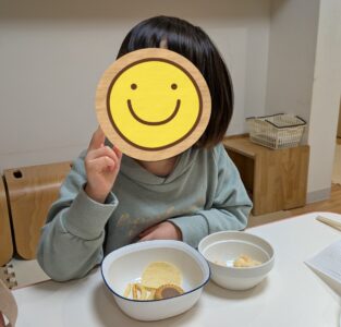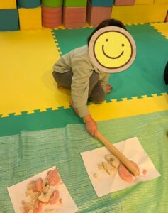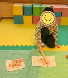 年末のクッキングで作った鏡餅を、麺棒を使ってみんなで叩き割りました!